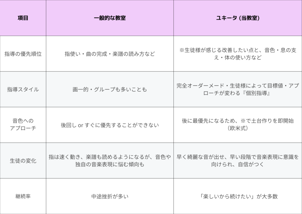 同時に、講師は『生徒様がどのような音を綺麗と感じ、どのような音を求めているのか』を確認することがとても大切です。これは生徒様お一人おひとり違って当然であり、『これが綺麗な音です』と提示することは、講師の価値観の押し付けになってしまうことがあります。